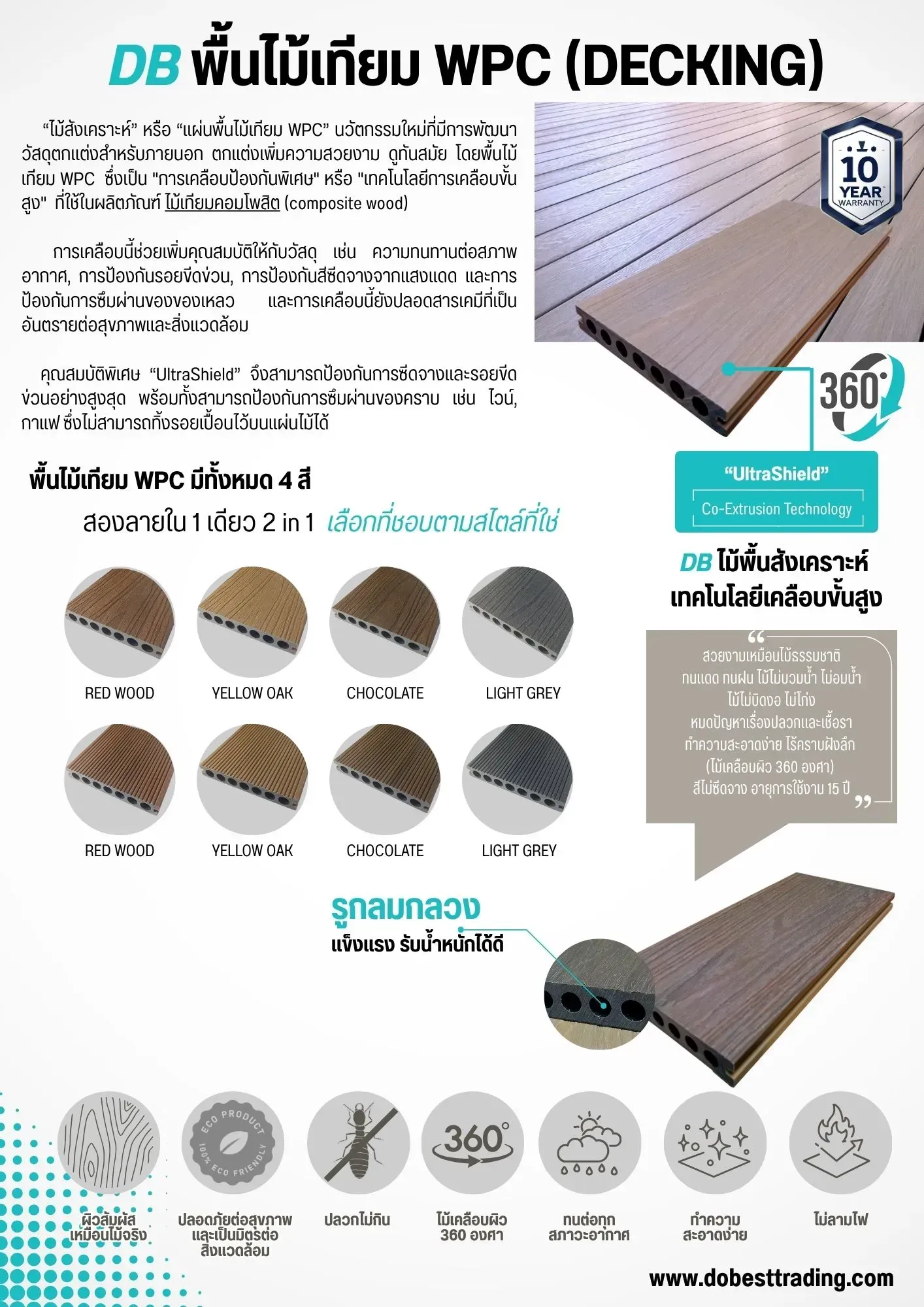 นวัตกรรมเทคโนโลยีการเคลือบขั้นสูง สวยงามเหมือนไม้ธรรมชาติ ทนแดด ทนฝน ไม่บวมน้ำ ไม่อมน้ำ ไม่บิดงอ ไม่โก่ง หมดปัญหาเรื่องปลวกและเชื้อรา